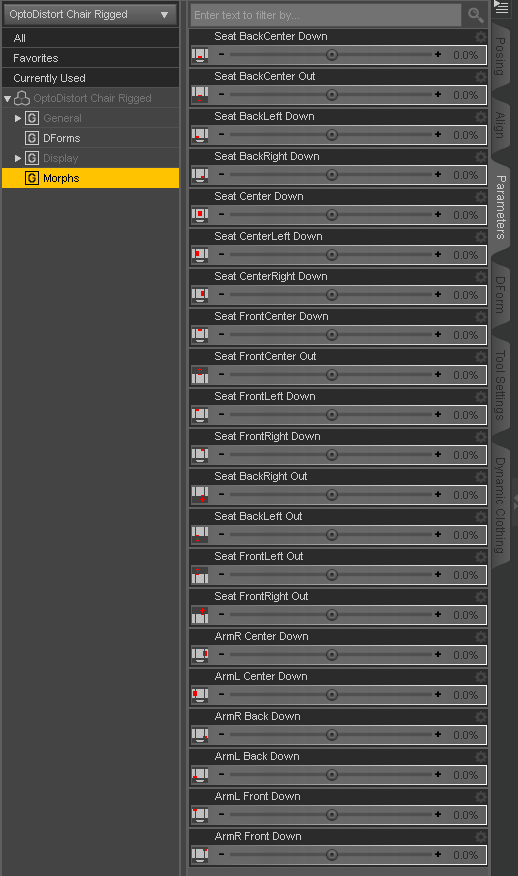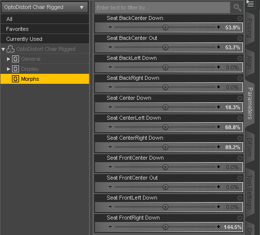 Morphs for the seat I did think about, and to do that for every possible 'sit' pose on that surface (one for the left, center, right, more this way, more that way, etc), I would get lost in the 'Morph' category, lol. I can make a few generic ones, and it isn't like the D-forms won't work at all. It would just take two or three (one for the front edge, one for the back edge, and one for the top), instead of just one.