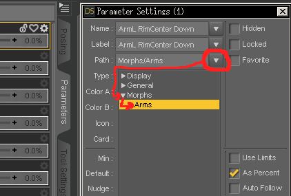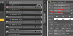 Oh.. and another "there is an easy way to do that" moment.. Right click the parameters tab, turn on Edit Mode, select all your morphs and right click, chose.. umm... set properety group? You'll find it.. poke around. That's also where you can turn on limits, set limit amounts, all sorts of good stuff on a whole pile of morphs at once.. 'cause gonig into the properties of 70 moprhs one at a time gets.. teedious..
