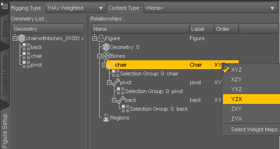 5. Right click left side, import fixed up obj, drag geometry from left side to right side, rename the top two fields to get rid of the numbers (optional step), drag back to pivot and pivot to seat so they're nessled/parented correctly. Change bone dirrections all to YZX (that's up and down, I just know that from experience) Click create button