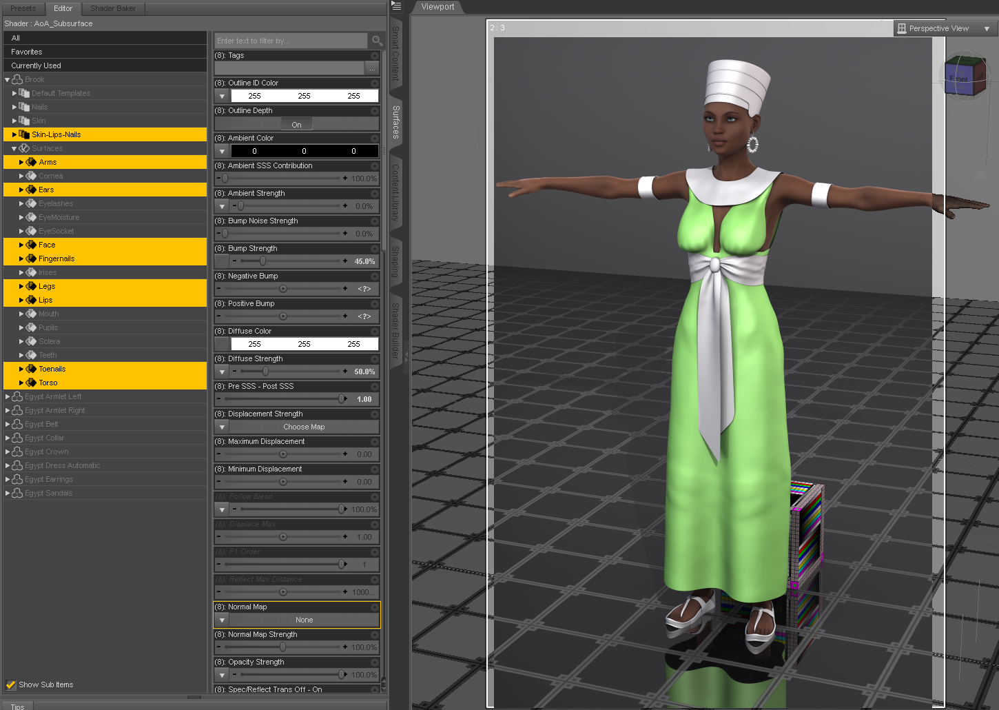 I'm a little uneasy posting someone else's actual settings, especially when the settings are part of a product that was Purchased. And that's why I didn't do the massive Scroll of settings for OzyChick Brook. I will say, Brooks eyes are using a different shader then AoA for the eyes, and they do not add a double penalty to the Precompute delay (Whatever the eyes are on, it's perfect). As for the skin they look the same between Brook, and 'Figures X Y Z'.