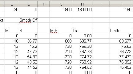 Left to right... 'M' is for the Minutes in the log file, 'S' is for the Seconds. That separation makes it a tad easier to add up for a single unit of time. 'MtS' (Minutes to Seconds) is simply the 'M' column multiplied by 60 to give me that unit in seconds, so it can be added to the 'S' column in the 'Ts' (Total seconds) column. In the former graph, I had simply divided the 'Ts' column by ten for plotting the pixels on the charts in the far right column (tenth).