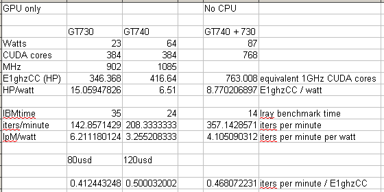 There are absolutely stars and "Mitigating" factors for that one chart I made up really quickly. I had other stuff going on, and was not going to shut down everything going on just to do some Iray testing for a few days, I have work to do. The watts listed is the TDP, not the measured watts that I've yet to do. The GT730 is driving my monitors so it has a handicap before even getting started. And that more impressive GT730+GT740 time still left my desktop unusable for doing other stuff while I wait for Iray to finish, the reason for looking into a second card for Iray. At least for the sub-one-hundred-watt cards that most can afford, running Iray on the card driving your monitors renders your computer useless for doing any kind of multitasking at all. I can't work like that, and as good as the Odroid is, there is a lot of stuff I have yet to figure out how to do on the thing, lol.