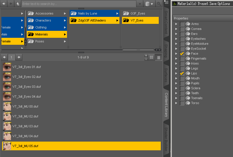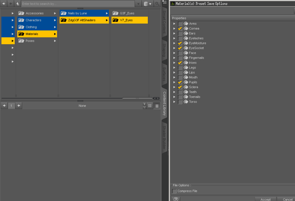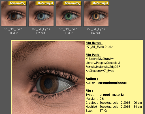 Eyes require swapping out the maps, and selecting the specific zones to save for the "Material Preset". Thankfully the zoning on G3F is a tad easier to work with then G2F when it comes to switching maps for some stuff, and it's fewer checkboxes to click threw in the Mat save selection window.