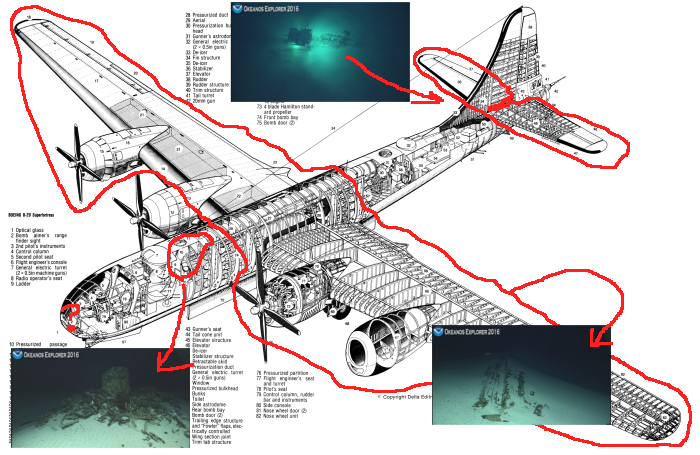 I say possibly, as some stuff was missing/buried, and I'm not sure if it is or is not all from a single B29 (I don't know). It appeared "The Four Corners" were around the dive location. There was a fairly full main wing (missing one of 4 engines), part of the front fuselage tunnel (I'm not sure how much of fuselage or nose cone was buried in the sediment), and a large section of the tail. It looked like bits of where the rear gunner would sit in the tail of the plain was in pieces between the site of the tail and the site of the tunnel, along with many other very small pieces that may or may not have been part of the plain. Over all a good dive from the looks of the vid replay.