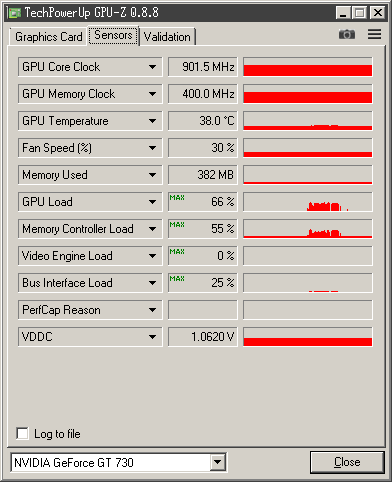 The massive blip in the center was me spinning around G3F in the scene, and the rest of the time I was trying out different mat settings. So, apparently there isn't much load at all on the GPU, unless you move around the scene in the view field. And the 4GB GT730 (GK208) apparently has plenty of room for a few more vids going at the same time while I'm working in Studio on stuff. I am curious if it can be brought up to the clock of the GT740 to see if that is all it takes to get 30% better Iray times or not, lol. I'm just doing some digging around first to see if it has the headroom or not for 100MHz higher clock without it crossing the "Fusion ignition" threshold, lol.