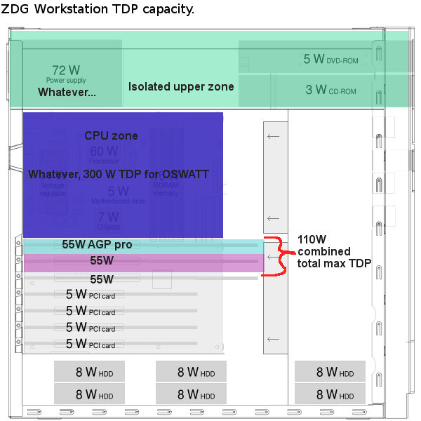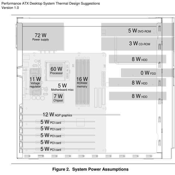 Now let me explain why I'm not comfortable exceeding that 100watt barrier. When I modded the case that is my workstation, I looked at all the ATX specs I could get my hands on. There is a few chapters that cover minimum air flow over different zones for cooling the innards of the computer. The old ATX standard is assuming a single 80mm intake fan at the front of the computer for cooling, and as you can see above that is not good at all for high watt components at all. It doesn't matter how good the heat sink is, if the case can't move the air fast enough, the components will simply not get the needed fresh air to keep there cool.