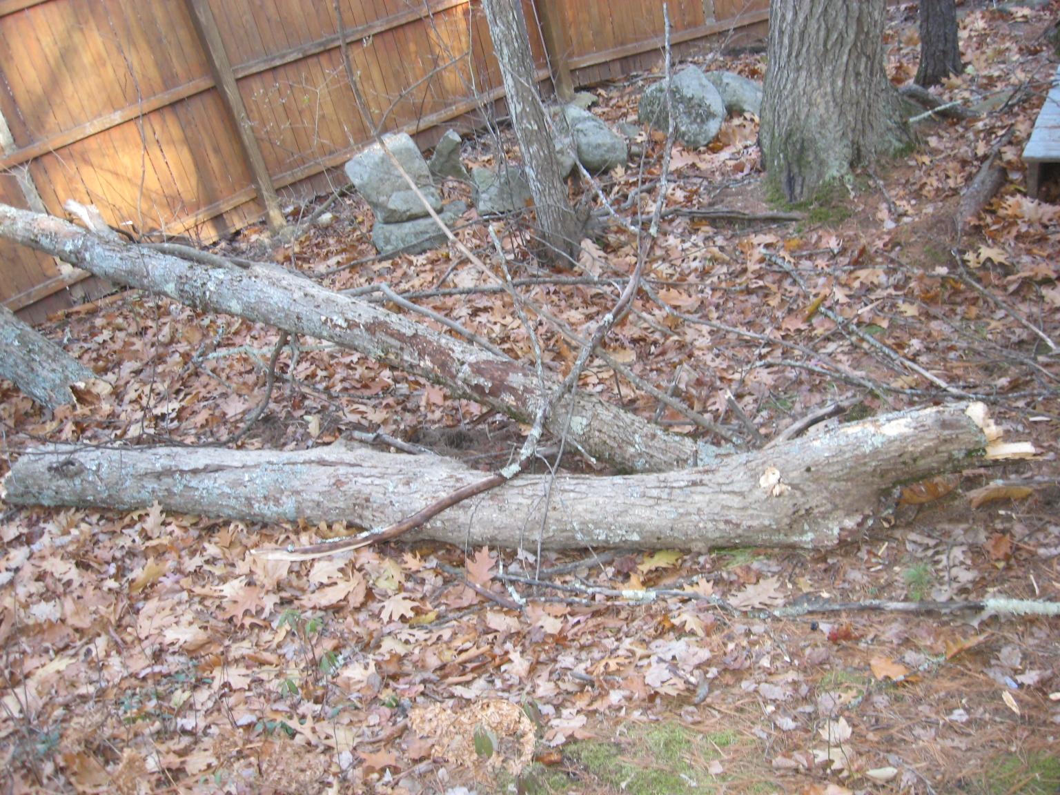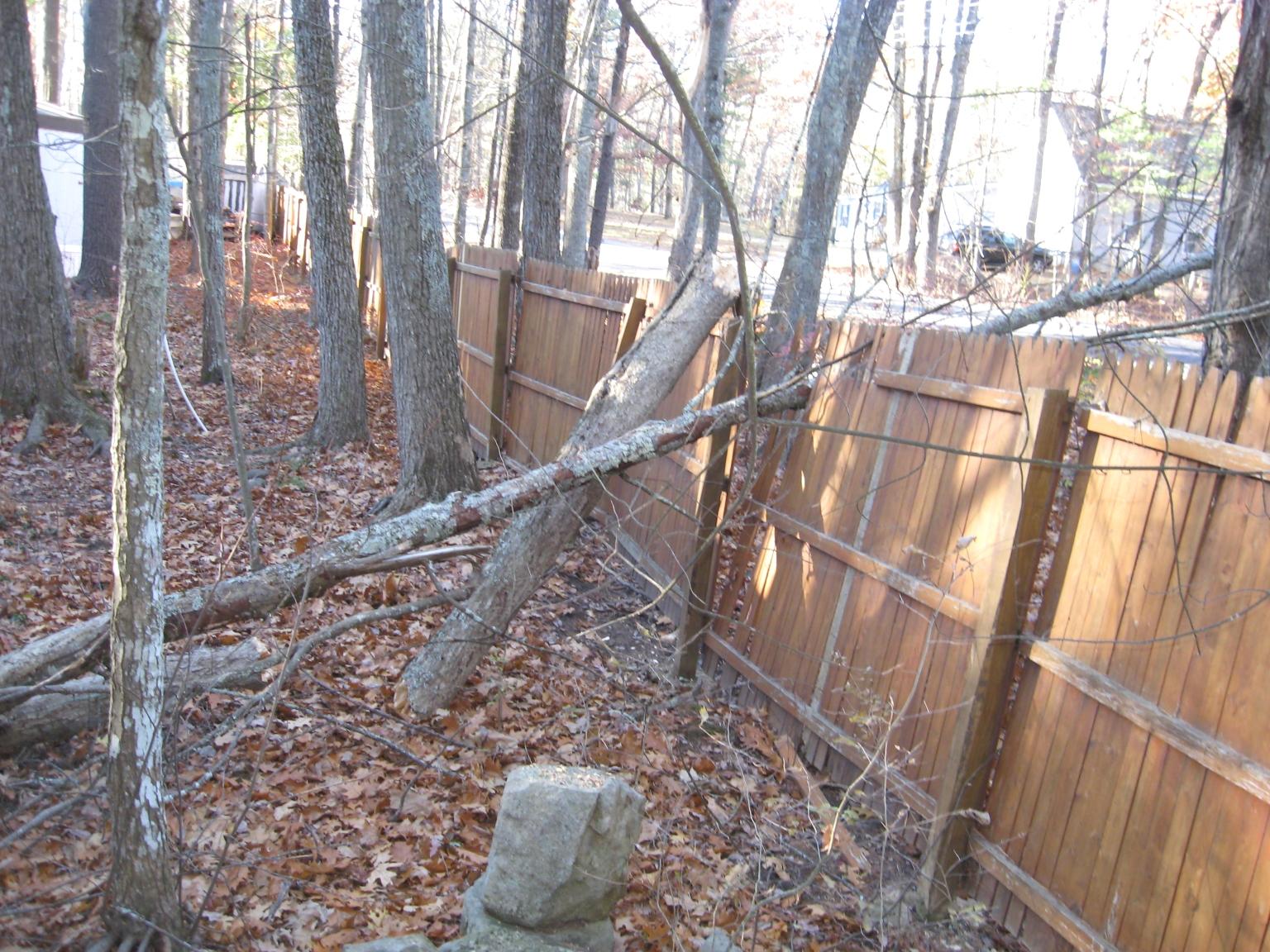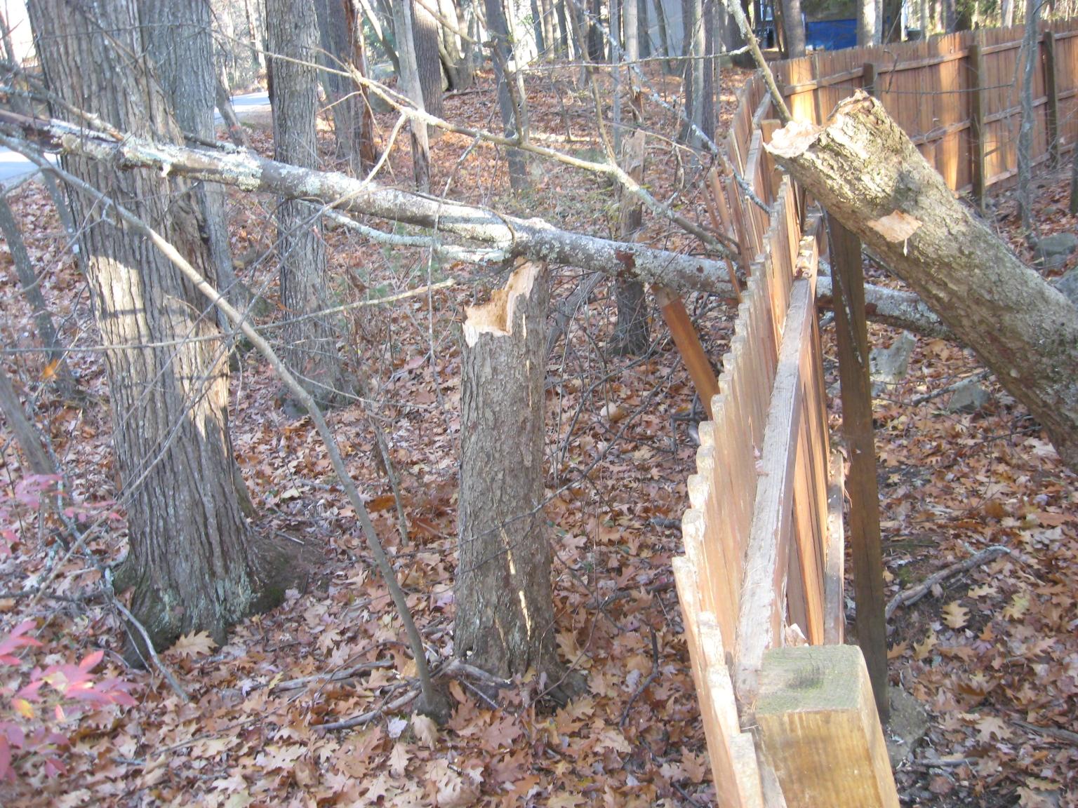 No one was harmed, and only the fence took a hit from the fallen tree. My neighbor was kind enough to bring it to my attention, as I had not noticed the thud over normal traffic noise on the road out yander.