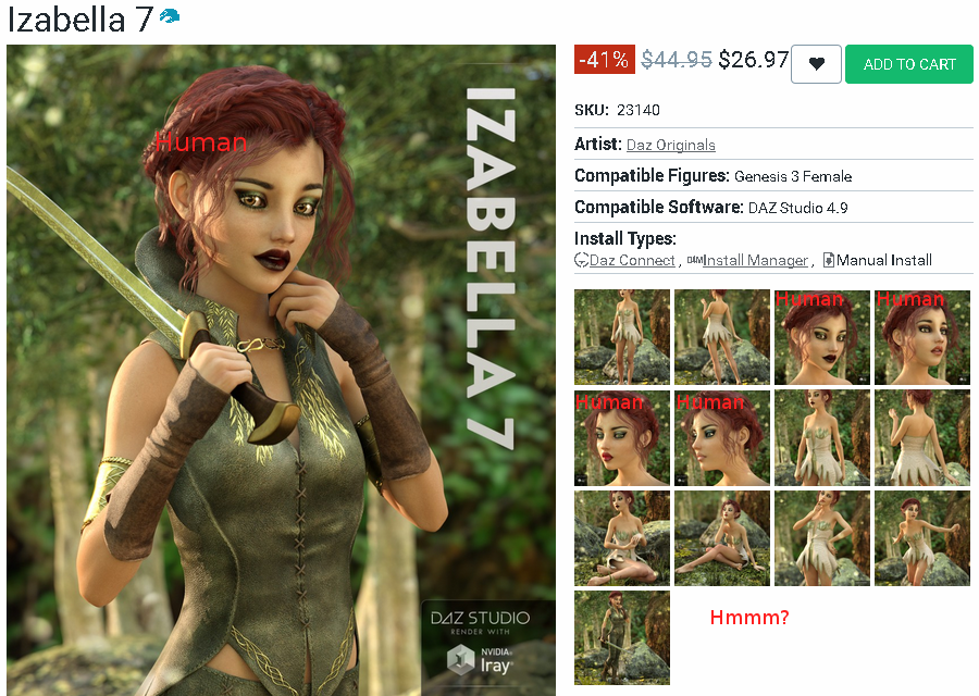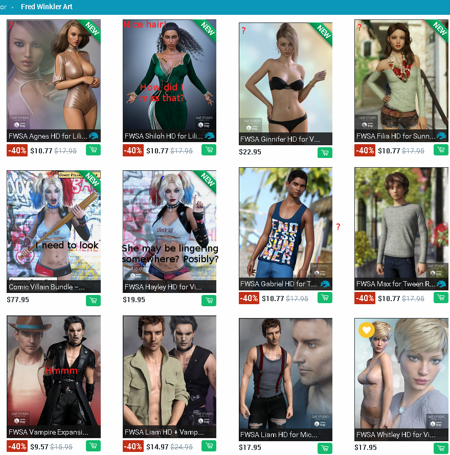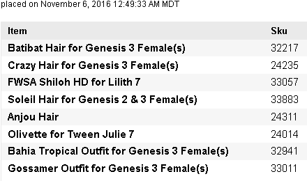 And, just so I'm clear, I'm not against buying stuff from daz3d, just that some of the older Gen7 stuff dose not work. Besides, I need some hair, and hopefully something in that list will work, lol. A while back I thought I had Gossamer, as it is now at full price. I'm a tad more tempted to get Bahia despite EJ's former gen7 stuff having significant difficulties on there own figures, lol. Eh, it's been over a year, they had to have gotten the memo by now