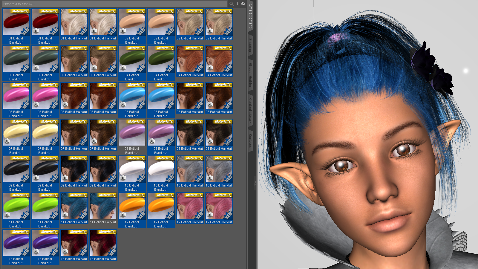 As for the Batibat hair, the bangs do appear to be independent zones, so they can be made transparent when you want to see the face. The color options are not as impressive as some EJ's gen6 elf styles, tho there is more then just the standard blond/black/brown colors.