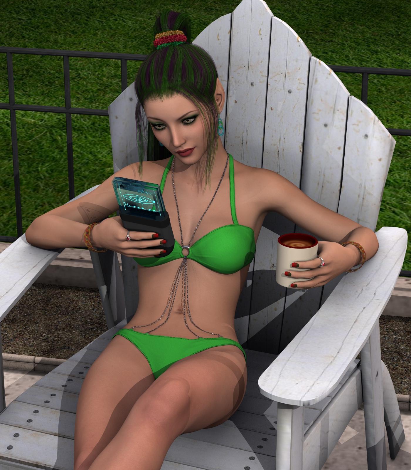 I realy don't have anything for Shiloh yet, it was just a quick "Dose it fit" test. Time for some coffee, and to play some more. Oh, by the way, Yulia's new earrings and bracelets (bangles, whatever, lol) came from FWSA Monika and the rings from Ring Collection for G3F. BTW, that Geneva hair is incredibly usable for many poses, because it has bones to pose the bangs/wisps and the tail (I did swap out the ponytail band with the three fuzzy toroids some time ago, explained in a vey old post way back).