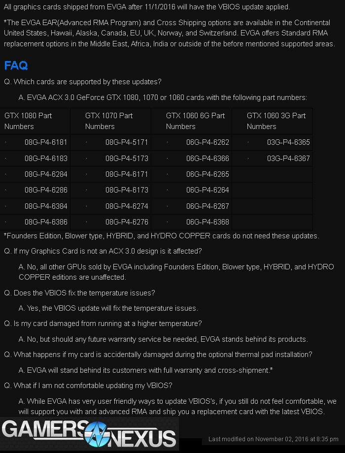 If you have an EVGA GTX10xx with the ACX3.0 cooler (list of affected cards is at Gamers Nexus's site and elsewhere), just get it addressed, overheated FETs do not give warnings before it's to late.