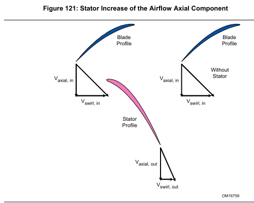 And that is how a stator can improve CFM, by turning 'swirl' into more axial exhaust velocity (lowering the back pressure on the fan Blades so they can move more air).