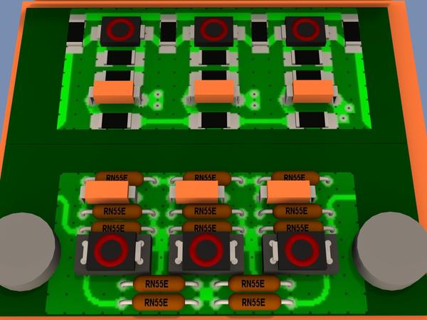 In the mean time, I decided to replace the RN55D resistors with MR2010 surface-mount things, as a mere thought. I kind of crudely laid out the parts in MS paint, rather then a more conventional way for the surface-mount version. Mostly to get an idea of size limits with the minimum spacing of stuff.