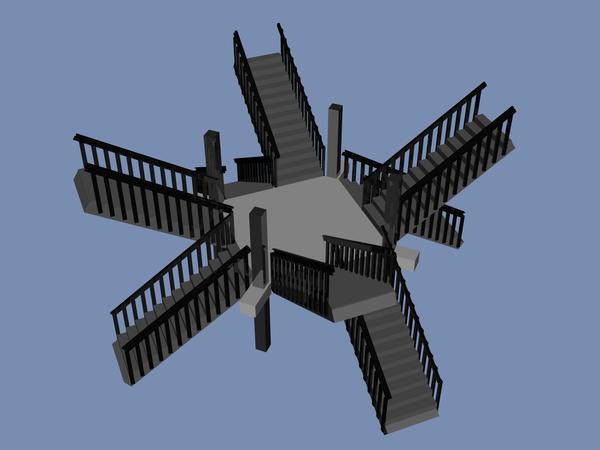 yes, lots of cubes scaled to the size of the steps, and a tone of finessing each one into it's place next to the others. I made the steps, and the railings separate exported obj, then started stacking them into the stair well assembly, with yet more cubes acting as the landings, and floors. At lest the concept anyways.