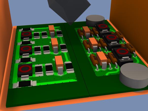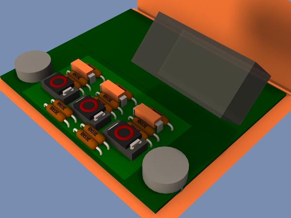 This is one of a dozen different RFI filter topologies I'm still looking at for the output of my Headphone Amplifier. I don't want to dwell on the technicalities of the LNA output filter, as I'm more interested in simple component placement possibilities. A simple geometric puzzle, using Daz Studio Primitives, lol.