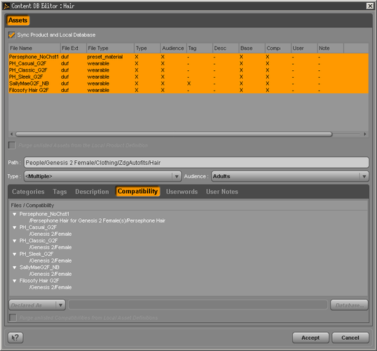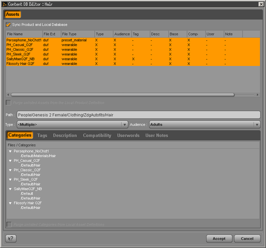 And apparently going threw the "Contend DB editor" was a complete waste of time. Well, ok, there is now pretty labels in the CL for the items. There just not in the Smart tab under hair (With or without G2F selected), and they still don't import into the smart tab with reimporting metadata.