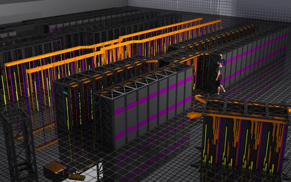 Yellow - Power, Orange - Fiber optic conduits, Red - Hot return coolant, Blue - Cool supply coolant...