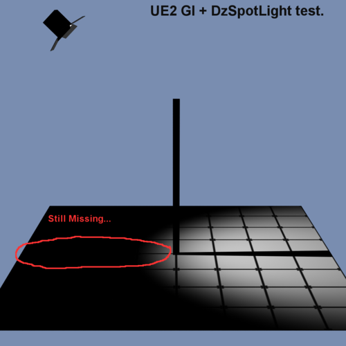 Using the Menu lights, Uber lights, DzSpotLights, or even the "IDG Luminous Fae - Dual Layer Gel Lights for DS", Makes no difference at all. The light is refusing to reflect off of the pillar to make a patch of light opposite to the shadow.