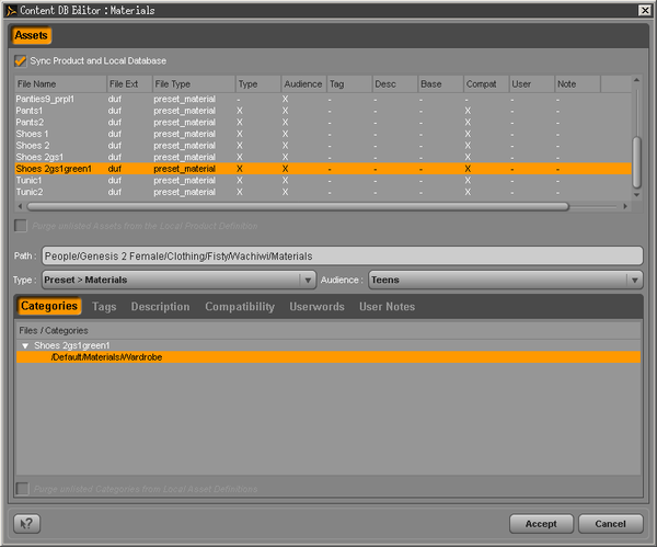 After making some green moccasins to go with the Faylinn Outfit, I still had to do a bit of "Contend DB editor" work. Namely remove that "Unassigned" category, and add the proper one.
