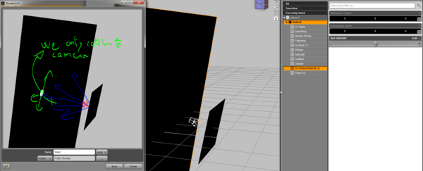 Obviously it didn't work, as that surface is somehow connected to the second camera, and another plane over the visible floor in the scene. It must require some Spaghetti magic of sorts to make it work from that one render angle alone. It dose not work from anywhere else in the scene, I did try that.