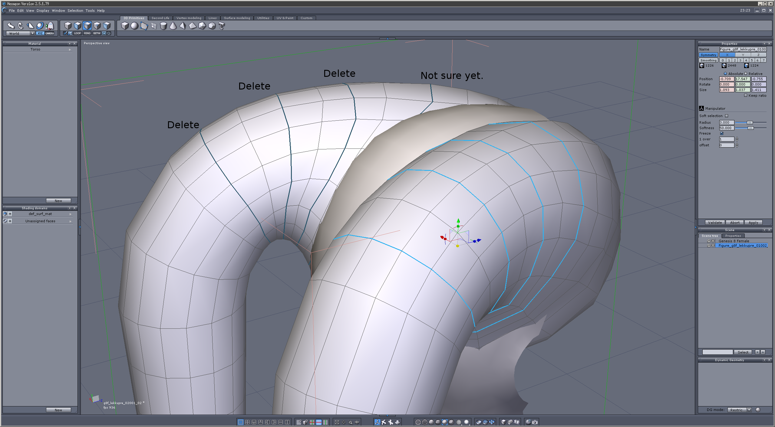 I'll need to find some hair for an example that I don't remember what one it was that best showed why dense mesh in the direction of the bone direction is not so good unless it is needed for the shape of the item and weight mapping is something you find easy to do (It is not so easy in Daz Studio). When the bone is moved, and especially scaled down, the row of faces at the root of the bone will move way more than the rest down the length of the bone, and that does cause unnatural looking effects. With hair, it ends up with mesh buckled and folded over itself when autofitted from one generation to the next. That is why I was thinking of removing some loops near the top of the Lekku, as that was just a toroid glued onto a cylinder to start making the item.