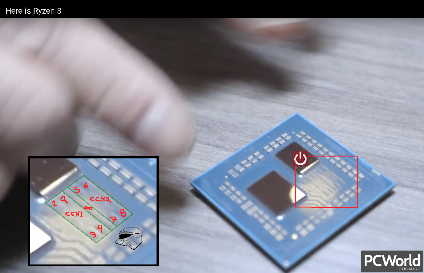 Left is an EPYC2that I had been working on when I had free time the past month-ish. right is an AM4 package that measures about 38x38mm. The dark green square on the EPYC2 is that 38x38mm (close enough to 37.8mm) AM4 substrate superimposed over the EPYC2's IO die and some chiplets. the IO die and two chiplets will fit with room to spare, lol. The pic was made before the Ryzen3000 announcement at CES, there are now pics of the actual CPU package, and some pics have light glair off them at just the right angle. the first is from the CES announcement that I screen capped from Tech Yes City's vid on the announcement.