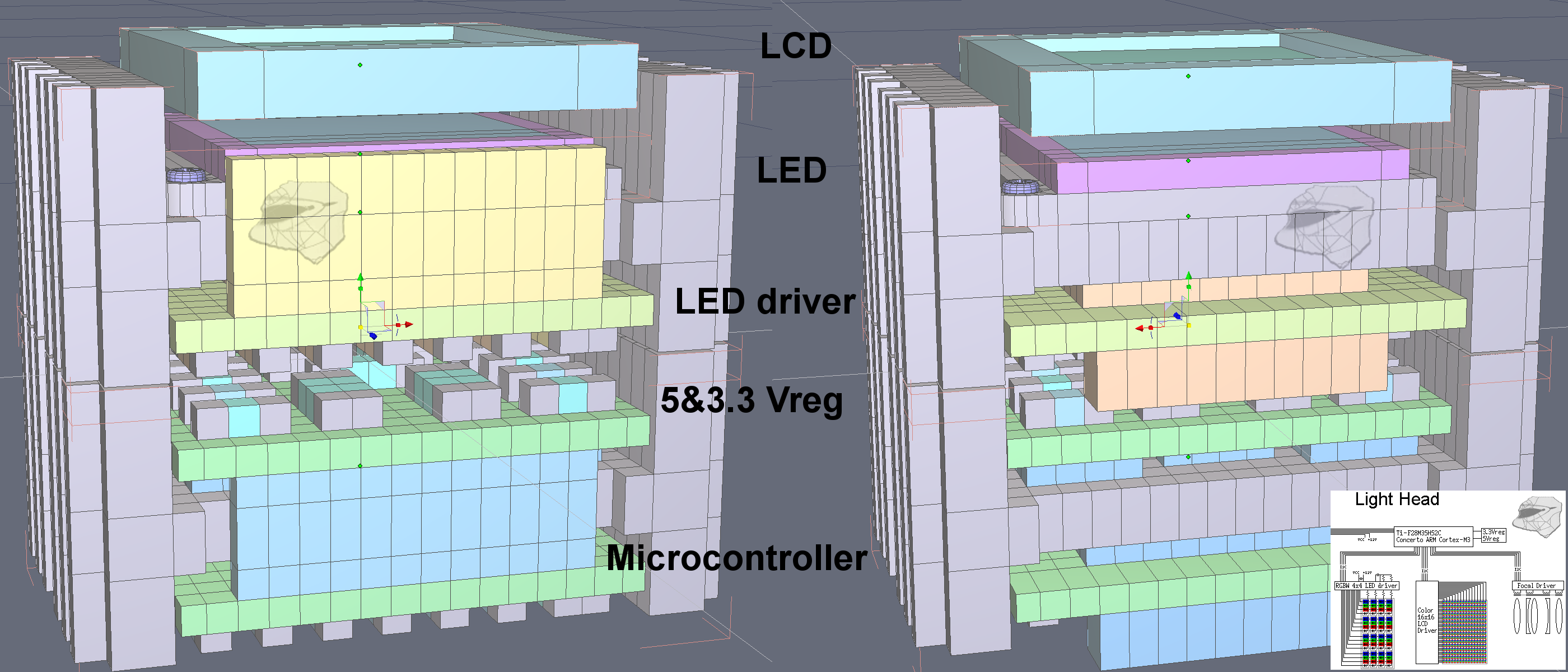 And it's not like the reduction from 380watt stage to more modest under ten-watt lights is going to be excessively large to make something doable. I'm looking at something about 2x2cm ballpark for a 3 to 4 cm long light can, depending on the lens assembly, that's small for a "3 in 1 moving head".