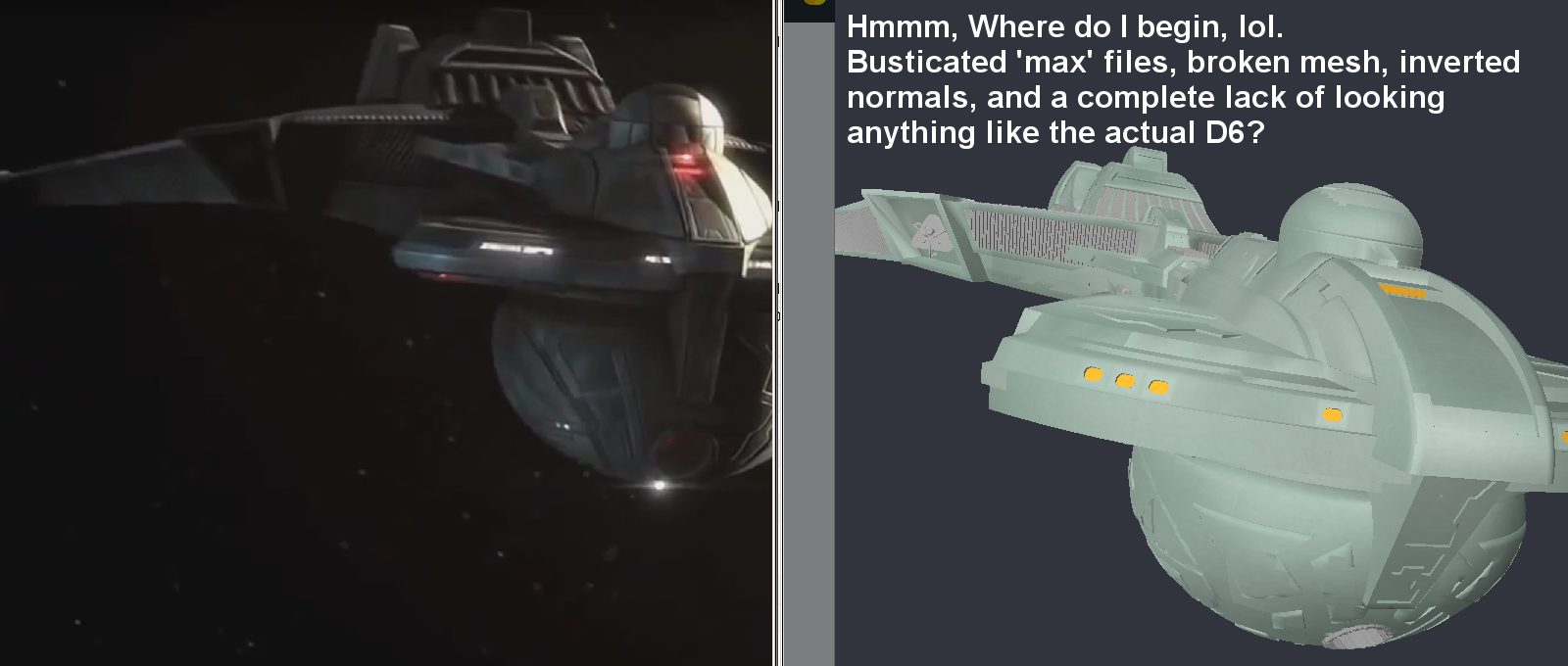 , rrrr, share-something, ShareCG (that was it), it's before coffee here, been a long week. The models at least load up without kicking file load errors, the geometry is still a mess tho. And to blunt and honest, I want a Chiss ship (that is yet to be fleshed out in Star Wars canon), and the D6 from Axanar. The latter I'm sure CBS/Paramount won't let me have given their hatred of Prime Trek of late, lol.