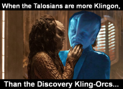 It can be said that The Last Jedi had a few things that didn't go over so well with fans, and one major Plot invention that arguably destroys the universe (The Holdo Maneuver). At least The Lest Jedi looked and felt like Star Wars. I can only guess that the management at CBS and Paramount are deliberately trying to destroy the Star Trek franchise, with the way they have gone after fans and imploded there own canon, in some twisted effort to make all Trek merchandise ever made undesirable. To Quote EvA, "The mind boggles". I don't think the Franchise confusion in Discovery has gotten to the point it is tarnishing other franchises, yet. Star Wars has enough difficulties as it is without Discovery injecting itself into the universe. It would be nice if the Studio would stop the madness, and focus on making a good Trek show, and leave James Bond, Stargate, Riddick, Battlestar Galactica, Lost in Space, Games of Thrones, and other franchises alone and out of it. It would also be nice if they would reseal the Orc hostages and let them return to Lord of the Rings where they belong.