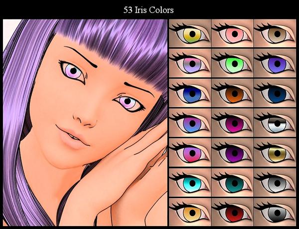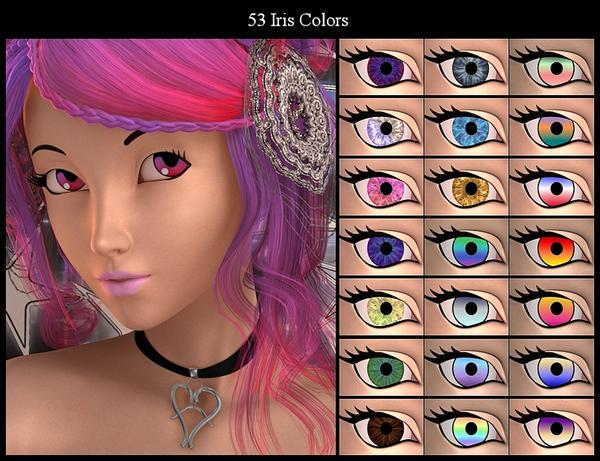 Toon Style Eyes for Genesis 2 Female(s) is a complete eye kit to customize your toon character's eyes. Included are over 50 iris colors, cornea patterns and eye reflections, plus a blank outlined iris and 2 grey gradient to allow you to pick any color you want in the diffuse channel. Mix and match all 3 to recreate your favorite toon type eyes.