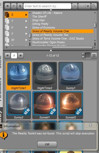 Hi All - I just purchased & installed Skies of Reality Vol 1 & 2. I've loaded a set/scene & when I try to load a setting from either of these volumes, I get a message box advising ' The Reality Toolkit was not found. The script will stop execution.' Can anyone tell me what I'm doing wrong?? Thank you.