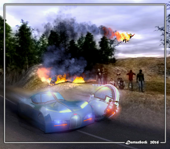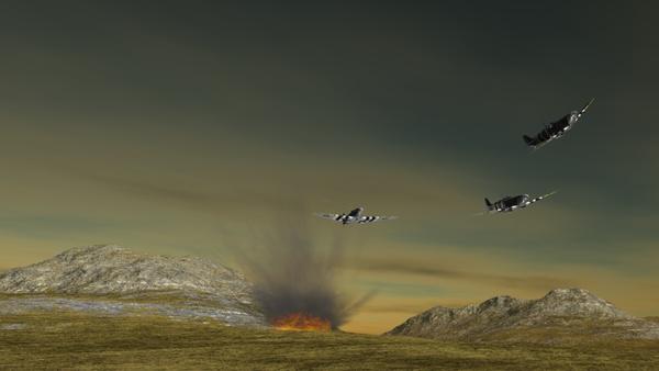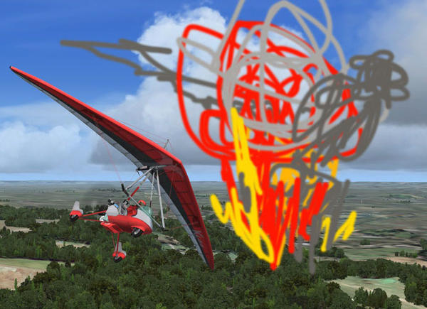 I've got assets for the microlight & people. Backdrop could be something like Dartan's Badlands, liberally sprinkled with bits of broken city, but I have no idea how to go about the explosion. So I'd be grateful for any suggestions.
