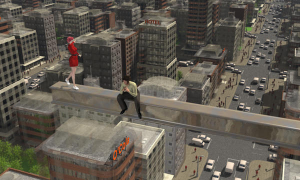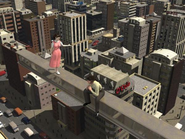 I didn't save the original file, so here is something that approximates it. No more ghost town. I made sure that the building EP identified was in the frame. A6 is wearing a modified nurse dress and her hair is the Cinnia hair. M4 is still has the 30s working man products.