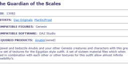 Thanks Taoz. I took a chance and bought a texture set, https://www.daz3d.com/the-guardian-of-the-scales, and it refered to "16 Daz Studio Materials for the Egyptian Style outfit." on the Product Page, but a search in the store didn't come up with it. I found something that looks close to it, https://www.daz3d.com/anubis, and I have wishlisted it.