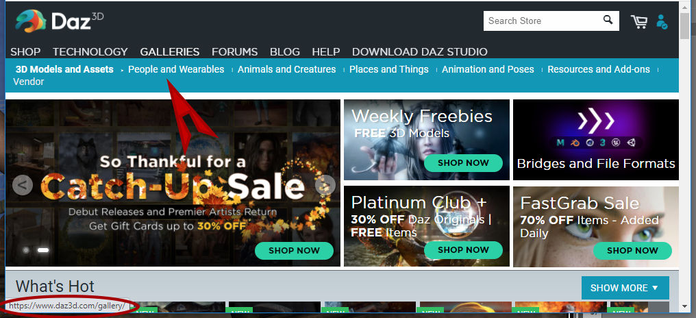 The URL is shown on the bottom of the Chrome browser page, to show what URL the link goes to. In this case, I made the Chrome window small vertically so you didn't have so much extraneous stuff to scroll through. The URL has nothing to do with What's Hot. What's Hot just happens to be on the bottom of my Chrome page. My cursor was hovering over People and Wearables, but you can see that the URL that it will go to is from the line above in the black bar (Gallery). It seems to be some kind of page formatting problem. I have had this problem for weeks. I don't think it is a cache or login state issue.