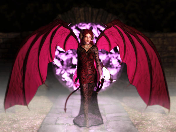 I think you have a great concept for a character and you have got it most of the way there in terms of components to meet your vision and like what you have done so far:). I few compositional suggestions I have that may help tweaking your current setup (this only a suggestion and there are as many ways as there are artists:). Perhaps angle the path to the centre of the image to break the symmetry and give a leading line into your character (this may mean moving the portal aside a little). I've done my share of demonic characters and I have found the Nightworld Wings set to a useful one from some fairly unique shaped wings and some helpful poses with them.