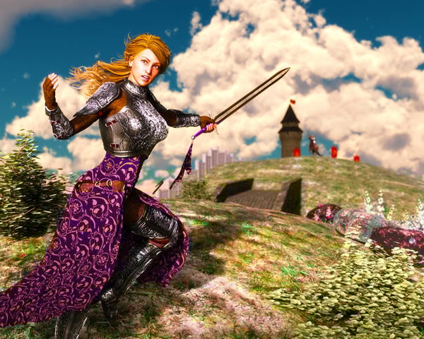 This is my latest, I also posted it in the User Gallery. I'm pretty happy with this one, there are a few details I'm noticing that could be improved, the rocks don't sit quite right, there's also a funny yellow hair along her hairline above her right ear that might need attention. Maybe her expression could use a little more urgency.