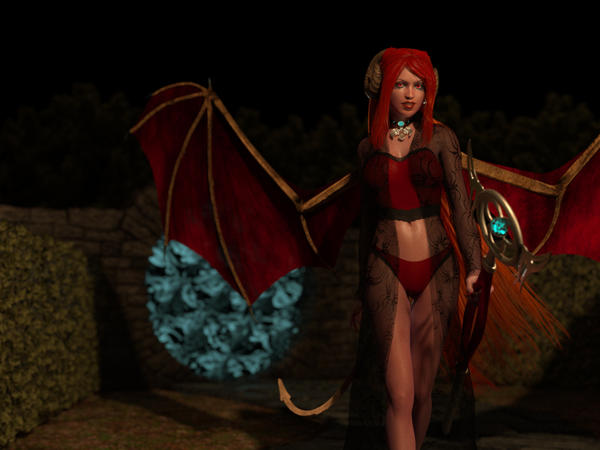 The character is completely in the center of the render, and the glowing circle and the wings really reinforce that position. That makes a tad in-your-face. I understand that putting things in the center is tempting, but the Rule of Thirds really has something going for it. Also, the wings take up a proportionally large part of the scene. That makes them pop out quite a bit, overwhelming the demoness herself.