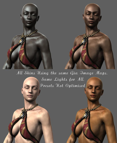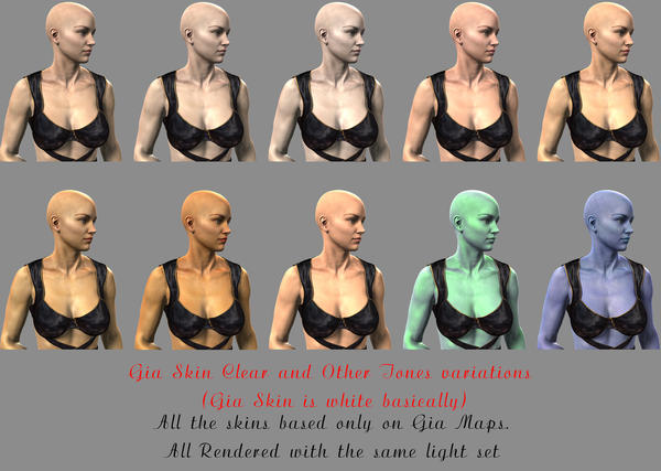 Here are examples of skins I made this afternoon, using a the Gia initial Material then amazing skins. For black skins, I had to force a bit one of the hidden parameters. But you see that based on a single texture, you can reach a lot of things.