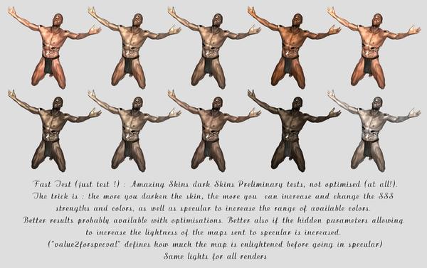Yes, this works fine for skin tones variations of white skins themselves, or of dark skins themselves, or plenty of fantasy skins, but I have not managed so far to turn a white figure in a dark one. Since I tried to test this morning if I could turn a black skin in a white skin (I could not have realistic things), I post here some of the renders obtained tweaking a bit base Hue Saturation and Value as well as both SSS features. The most "white" skin is the 6th left, first line, maybe I could do better but I lack of time. The darkest one is the fourth of fifth one on the second line.
