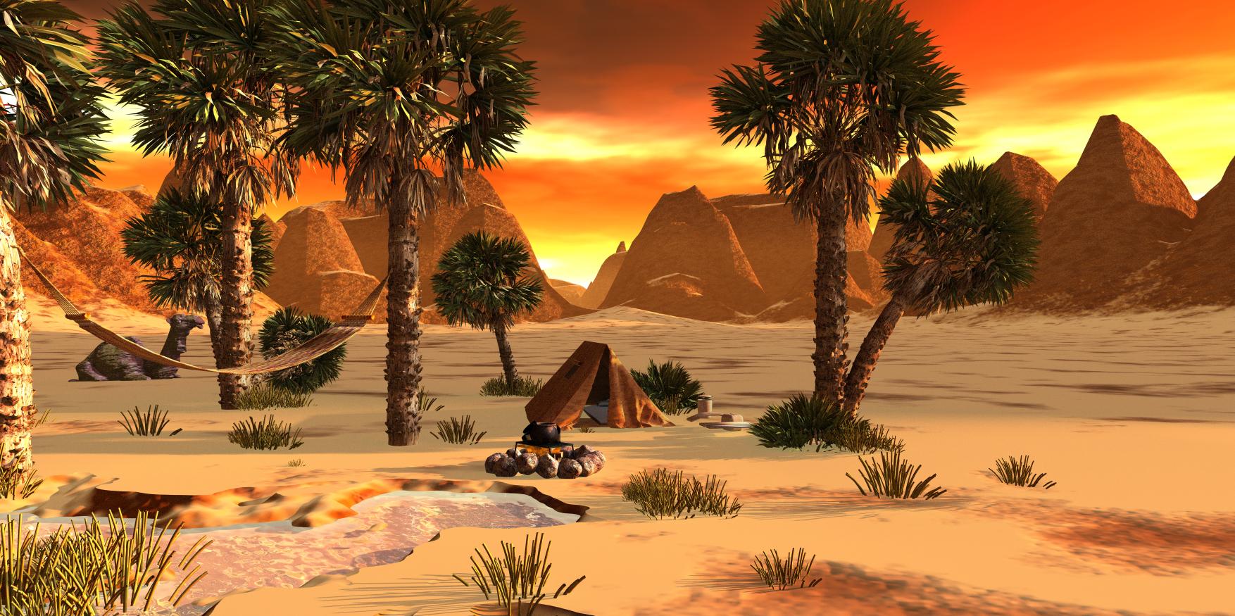 I made a first entry. Used a terrain from Karanta and an Oasis I found at Renderosity from Chacornac. That resulted in the trees and the tent and the bushes. I also found some additional items from another tent freebie from Nergal. The camel is also a freebie. Hope nobody really notices that it is a stone camel. The sky is one of the HDRI enhanced skies by Horo (Warm and Cloudy) that I ever so slightly modified. I added a very weak distant light that only lights the oasis items to get a bit more whitish light on these. Preset textures for the terrain and the water.