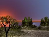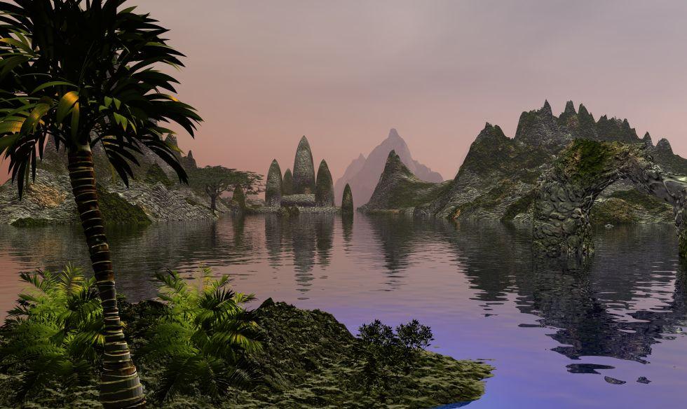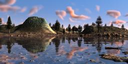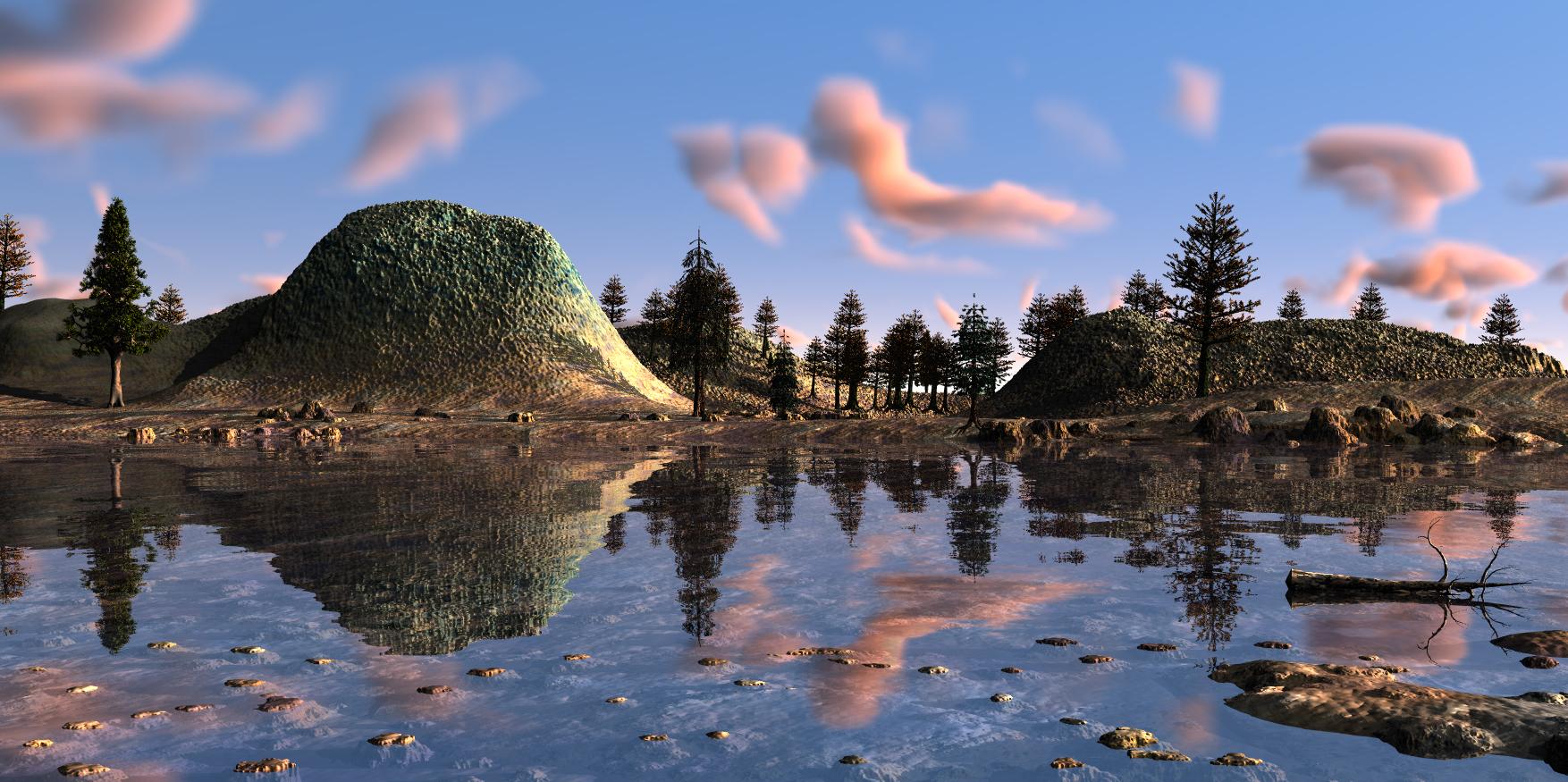 This one is based on a photo I saw somewhere. It contains multiple terrains, because the 'rocks' in the lake and on the opposite shore are actually terrains with mounds, in different sizes, but the same texture as the terrain at the back. The clouds are a volumetric cloud slab. I did play with the colour of the clouds to get them the way I wanted. Also, I used a weak distant light to light up the shadows, because I did not like the effect of true ambience. I excluded the cloud slab from this distant light for render time reasons and because it would change the colour too much. There are a couple of trees, of which two are instanced a couple of times.