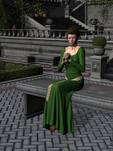The first and second renders show the gown and its sash on V4 (for which it was made) - these are two of the fabric variants: the leaf green silk and the ruby velvet. These were both done with an animated drape. For the seated pose I introduced a primitive plane and cube with many divisions to drape the dress because otherwise it was dropping through the ground and seat in the scene, which is from The Village Courtyard 02 by Stonemason (then hid them for the render).