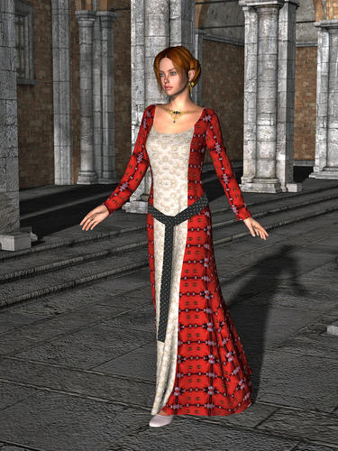 The final pair of renders show the gown on a G2F character, Ginger by DAZ3D/Countess/Silver. Animated drapes over a primitive plane again - and as Ginger is shorter than V4 I used the "Shrink Y" parameter for the gown to shorten it. I had a little trouble getting the sash right this time - if I'd had more time I'd have tweaked some more to get it right - but instead I just cheated a little by freezing the drape then moving the sash up and sideways a little to remove the poke-through I was getting from the dress. The first of these shows another of the provided fabric variants: the rose weave. The second is a retexturing job with shaders from Ye Olde Clothe Bundle by Marieah/Teresa Tyllo. (For Matzones, the front and back of the gown are each divided into three panels and the left and right sleeves are each separate zones, so it gives quite a bit of scope for playing with shaders.)