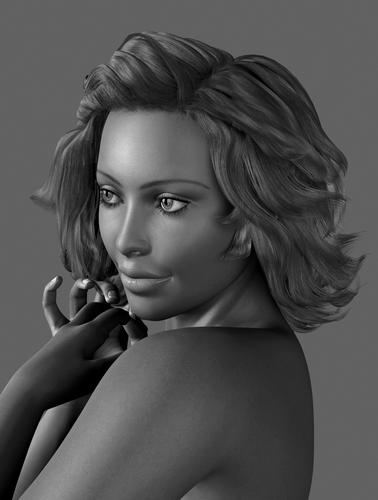 Shown on Genesis. First hair is the Georgina Hair, those with the dress are Classic Rolled Hair. I really like both of these, and they are by Goldtassel. For the portrait, I wanted to show several different "looks" based on the lighting- compare her forehead, the cheek closest to us, and her arm/hand which is extremely dark. So depending on what you want and how you light Janessa, you'll get quite the variety of skin color!