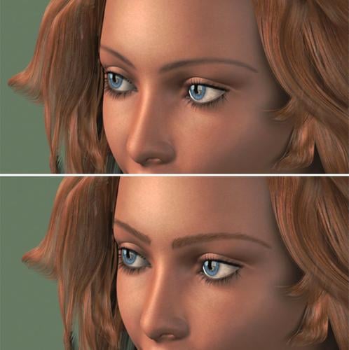 EDIT: I (fast) doodled with the brows to make them thicker and with some individual hairs- and to make the beginning of the brow have a few hairs going the other direction. I put the red in, then a dark, then the original color in for the top layer. Since she had red hair, the brows didn't go well anyway.