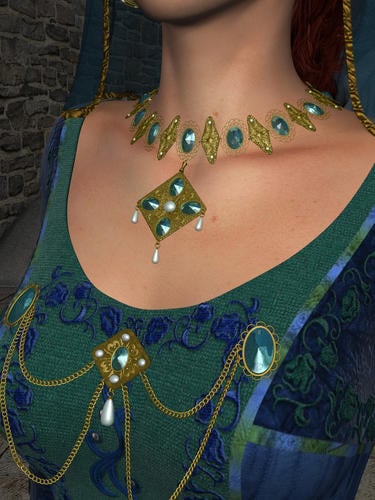 The first two images are with the original textures for the Medieval Fantasy Accessories, but I also tried the jewellery with some Gemologica shaders by Fisty/Marieah - the necklace in particular came out rather well with gemstone shaders, I think.