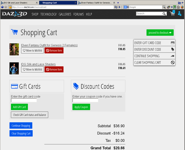 Looks like Daz3D is slowly (tedious and delicate) working out the bugs with there new website. The cart now shows more then "1", and subtotals are back.