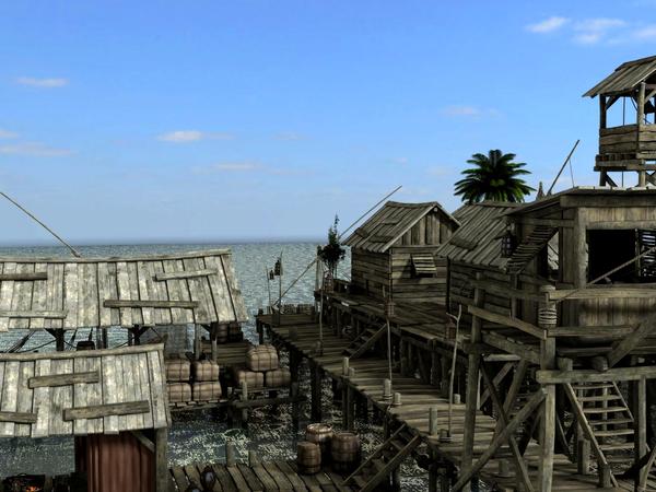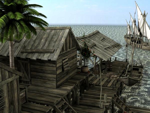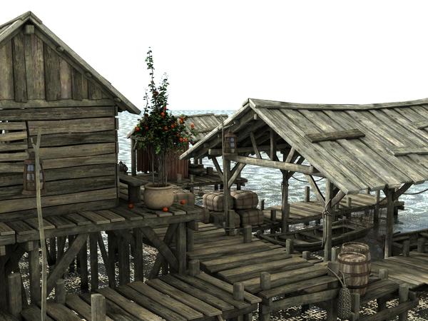 I tweaked the lights a bit and my water doesn't look right- want everyone to know it's ME and not the product. I started the renders then left them to do their thing so didn't notice the water. I'm using the UE2 and Sunlight but had to increase/lower settings for the shadow grunge when I did the figure. I'll try re-rending with the original settings, but here's some shots of the buildings and ignore the water for now. Love this set, so many nooks and crannies! (I even "wandered" into the rooms.)