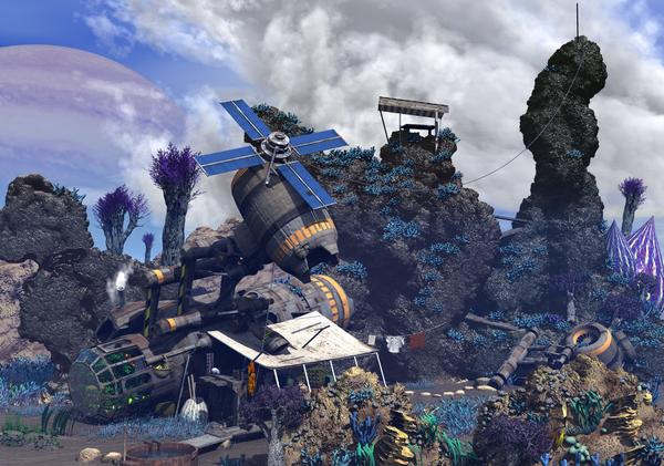 Sean Riesch, both very nice, I'm really digging the wrecked spaceship converted into a sci-fi Robinson Crusoe/Swiss Family Robinson home. Very complex, every time I look I see something else I missed before. And the quality, like Rashad's early renders, makes me say 'wow, is that really Bryce?'. Bryce is obviously a more capable renderer than I've given it credit for in the past. And those clouds are first rate, I would have thought they were Vue clouds actually.